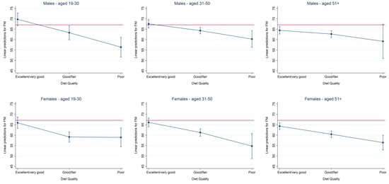 Marginsplot—Food Nutrient Index (FNI) by self-perceived Diet Quality (DQ) category in men (top row) and women (bottom). Top: Plot of marginal predicted values for men aged 19–30 years (left), 31–50 years (middle), and 51+ years (right) based on a multivariate linear regression model adjusting for race/ethnicity, educational level, marital status, and annual household income. Bottom: Plot of marginal predicted values for women aged 19–30 years (left), 31–50 years (middle), and 51+ years (right).
