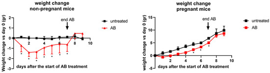 Weight changes of untreated and AB-treated pregnant (left graph) and non-pregnant (right graph) mice. For pregnant mice: day 0 (the start of the experiment) was day 9 of pregnancy; day 9 was day 18 of pregnancy, i.e., day of sacrifice. Pregnant AB-treated mice: n = 9; untreated pregnant mice: n = 9; non-pregnant AB-treated mice: n = 10; untreated non-pregnant mice: n = 11. *: AB-treated mice vs. control mice on the same day of treatment. Mann–Whitney U test, p < 0.05.