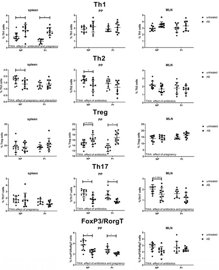 The T cell subsets Th1 (Tbet+ Th cells), Th2 (GATA3+ Th cells), Treg (Regulatory T cells (FoxP3+ Th cells)), Th17 (RoRgT+ Th cells) and FoxP3/RoRgT double-positive Th cells in the spleens, Peyer’s patches (PP) and mesenteric lymph nodes (MLN) of pregnant and non-pregnant antibiotic-treated (AB) and control mice. Pregnant AB-treated mice: n = 9; untreated pregnant mice: n = 9; non-pregnant AB-treated mice: n = 10; untreated non-pregnant mice: n = 11. *: Two-way ANOVA was performed for all subsets in the spleens, PP and MLN followed by Sidak’s multiple comparison test, p < 0.05.