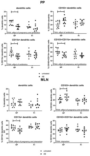 Percentage of dendritic cells and dendritic cell populations in the PP (left) and MLN (right) of pregnant and non-pregnant control and AB-treated mice. Pregnant AB-treated mice: n = 9; untreated pregnant mice: n = 9 (n = 8 for MLN, from 1 mouse, the MLN was not isolated); non-pregnant AB-treated mice: n = 10 (n = 9 for MLN, from 1 mouse the MLN was not isolated); untreated non-pregnant mice: n = 11. *: Two-way ANOVA was performed for all subsets in the PP and MLN, followed by Sidak’s multiple comparison test, p < 0.05.