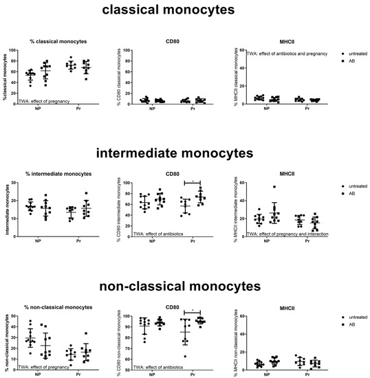 Although AB treatment did not affect circulating monocyte subpopulations, it affected the activational status of monocytes. CD80 expression was increased by AB treatment on intermediate and non-classical monocytes (TWA p < 0.05). Post-testing showed that in both intermediate monocytes and non-classical monocytes, CD80 expression was significantly increased by AB treatment in pregnant mice, but not in non-pregnant mice (Sidak’s multiple comparison test, p < 0.05). The expression of MHCII was affected (decreased) by AB on classical monocytes (TWA, p < 0.05), while we found an effect of pregnancy and an interaction between pregnancy and antibiotic treatment for the expression of MHCII on intermediate monocytes.
