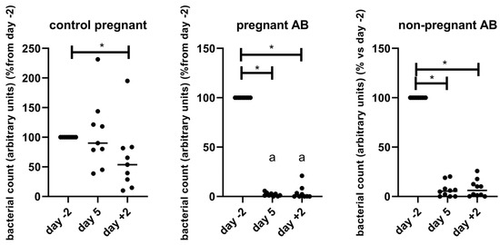 Bacterial counts, as a percentage of day −2, i.e., before treatment, in control pregnant mice and in pregnant and non-pregnant AB-treated mice. Bacterial counts were measured using qPCR and fold change of delta Ct was used as a proxy of bacterial counts. Pregnant AB-treated mice: n = 9; untreated pregnant mice: n = 9; non-pregnant AB-treated mice: n = 8. *: Friedman followed by Dunn’s multiple comparison test, p < 0.05. a: significantly different from control pregnant mice on the same day. Kruskall–Wallis test followed by Dunn’s multiple comparison test, p < 0.05.
