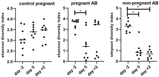 The Shannon index of control pregnant mice did not change during pregnancy (Friedman, p > 0.05). However, in AB-treated pregnant mice, the Shannon index decreased significantly during AB treatment; 2 days after AB treatment, the Shannon index was not significantly different from the Shannon index of the mice before the start of the AB treatment. In non-pregnant mice, the Shannon index significantly decreased during AB treatment and remained significantly decreased 2 days after AB treatment. In untreated non-pregnant mice, the Shannon index at day +2 was similar to the Shannon index of non-pregnant AB-treated mice at day −2, i.e., before AB treatment (results not shown). There were no differences in Shannon index between the different groups (Kruskall–Wallis test followed by Dunn’s multiple comparison test, p > 0.05)