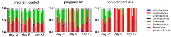 Bacterial phyla in control pregnant mice and in AB-treated pregnant and non-pregnant mice before (day −2), during (day 5) and after treatment (day +2). Pregnant AB-treated mice: n = 9; untreated pregnant mice: n = 9; non-pregnant AB-treated mice: n = 8.