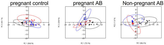 To further investigate bacterial differences between the groups, we analyzed the difference in bacterial genera before, during and after AB treatment in pregnant and non-pregnant mice. We performed PCA analysis (Figure 9) on the level of genera for pregnant control mice (left) pregnant AB-treated (middle) as well as for non-pregnant AB-treated mice (right). See also Figure S3 in the Supplementary Materials.