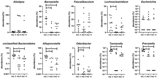 Various microbial genera before (day −2) and during (day 5) and after (day +2) AB treatment of pregnant mice. (n = 9). *: Friedman followed by Dunn’s multiple comparison test, p < 0.05.