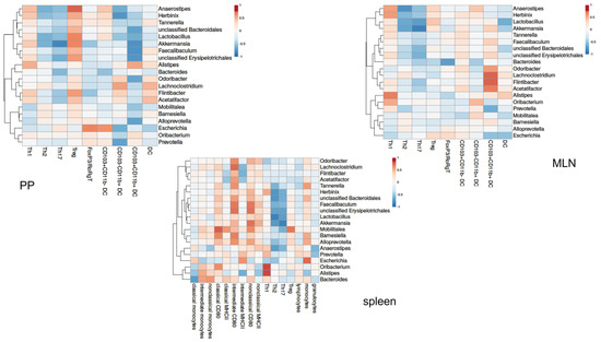 Spearman’s correlation was also evaluated between immune cells in the spleen, PP and MLN and bacterial genera. We used bacterial genera that were different before and after AB treatment. We also added the top 10 bacterial genera from the SIMPER test. Heatmaps from the Spearman’s correlation coefficients were produced using CLUSTVIS, with cluster analysis for bacteria using Euclidean distance and Ward’s clustering [22].