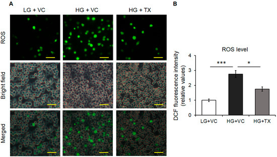 3.2. Effects of Taxifolin on the Intracellular ROS Levels Induced in an HG Environment