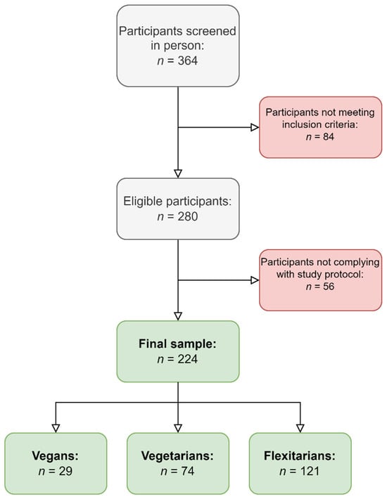 The study sample comprised n = 29 vegans, n = 74 lacto-ovo-vegetarians and n = 121 flexitarians. Figure 1 shows a participant inclusion flowchart.