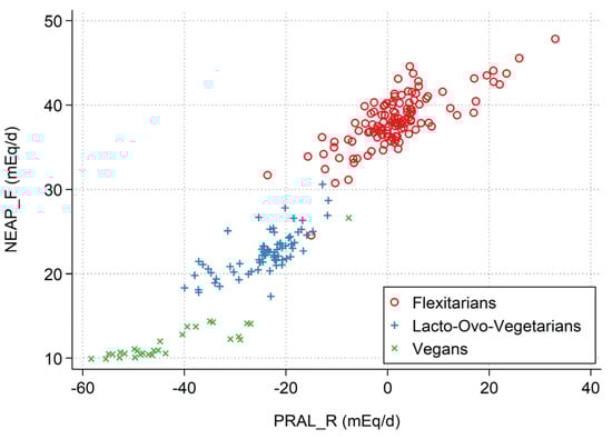 Our analysis has several other strengths and weaknesses that warrant a further discussion. The strengths include the moderate sample size (n = 224) and the inclusion of three different DAL metrics (PRALR, NEAPR and NEAPF). As mentioned earlier, we are the first group to examine DAL scores in Venezuelan flexitarians, vegetarians and vegans. A major weakness is the lack of urinary acid load markers, as recently reported by Penczynski et al. []. For additional insights, researchers were recently encouraged to collect measures of urinary PRAL and NEAP; however, said measurements were not part of our study. In addition, we had no detailed information on the protein quality and amino acid distribution available for our sample. The latter would have allowed for additional insights into the diet composition of our sample.