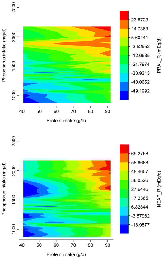 Figure 3 shows two contour plots to visualize the relationship between protein intake, phosphorus intake (which both contribute acid precursors) and the two DAL estimates by Remer et al. (PRALR and NEAPR) []. PRALR is shown at the top, whereas NEAPR is shown at the bottom. Both plots highlight the importance of protein as a main DAL contributor.