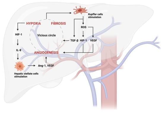 Vicious circle generated from hypoxia, fibrosis, and angiogenesis in liver disease. Hypoxia activates hypoxia-inducible factors (HIFs), such as HIF-1, which, among other things, stimulates hepatic stellate cell (HSC) activation via IL-8 production. They consequently produce angiogenic factors, such as Ang-1 (Angiopoietin-1) and VEGF (vascular endothelial growth factor). The stimulation of Kupffer cells by the vicious circle further aggravates this pathological process through TGF-β release. Furthermore, Kupffer cells can produce ROS-inducing new vessel formation through the stimulation of HIF-1 and VEGF.