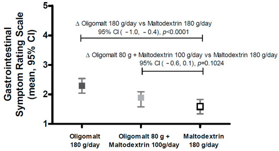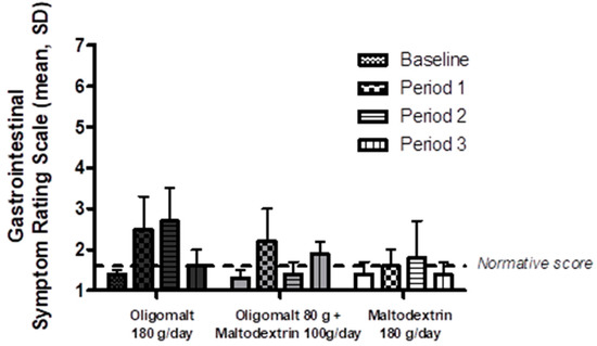 This observation was also supported by more granular analysis assessing intake of oligomalt or maltodextrin by intervention sequence (Figure 4); for examples, in people who received oligomalt 180 g/day as their third intervention sequence (i.e., after having received maltodextrin 180 g/day and oligomalt 80 g + maltodextrin 100 g/day in the preceding weeks), the mean ± standard deviation GSRS was 1.6 ± 0.4, which was numerically no different from their baseline GSRS (1.4 ± 0.3).