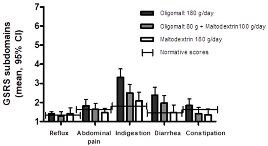 Subdomain scores for the Gastrointestinal Symptom Rating Scale (GSRS) by intervention, regardless of intervention sequence. The figure shows the mean (95% CI) (Y-axis) as well as the published GSRS subdomain normative scores. Abbreviations: g—day; CI—confidence interval.