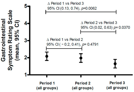 The corresponding overall GSRS value (regardless of intervention) by period (i.e., week 1, week 2, or week 3) is depicted in Figure 3, and it indicates a dynamic pattern with a higher overall GSRS score for the first intervention period (2.08 [1.84, 2.33]) than the second (1.98 [1.73, 2.23]) and third periods (1.65 [1.40, 1.90]), indicating a physiologic GI adaption to all products with time. There was a significant difference between period 1 and 3 (difference: [0.13, 0.74], p = 0.0062) and between period 2 and 3 (difference: [0.02, 0.63], p = 0.0370). Of note, within period 3, the overall GSRS score was within the reference range (~1.6–1.7) [26].