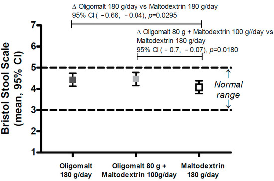Figure 5 displays the effects on stool consistency, and as indicated, there were no clinically relevant differences in Bristol Stool Scale across intervention groups, which were all considered to be within the normal range of 3–5 [23] (oligomalt 180 g/day 4.43 [4.13, 4.74], oligomalt 80 g + maltodextrin 100 g/day 4.47 [4.16, 4.77], maltodextrin 180 g/day 4.08 [3.79, 4.38]). However, statistically significant differences were noted between both the 80 g oligomalt + maltodextrin 100 g/day group and the maltodextrin 180 g/day group (difference: [−0.7, −0.07], p = 0.02), as well as the 180 g/day oligomalt and maltodextrin 180 g/day group (difference [−0.66, −0.04], p = 0.03), but without clinical relevance.