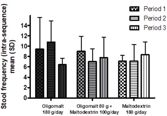 Stool frequency by product and intervention sequence (Figure 6), obtained from the number of entries into the Bristol Stool Scale questionnaire, also supports this observation.