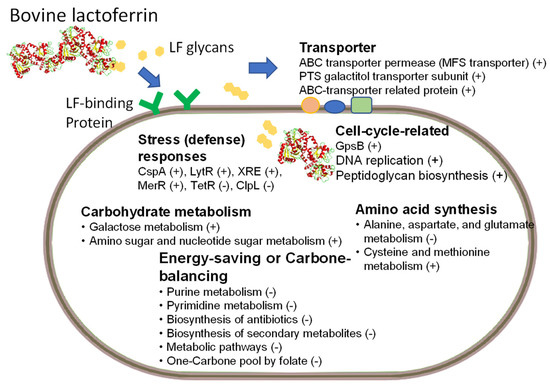 Featured prebiotic ability of BLF: Lacticaseibacillus rhamnosus GG strain was cultured in MRS medium with and without various concentrations of bovine lactoferrin (BLF) at 22 °C. Central molecular pathways or genes are shown that were modulated by bovine lactoferrin (LF) supplementation in LGG incubated in a cold environment (22 °C). Increased or decreased expression is described by a plus symbol, “+”, or a minus symbol, “-”, respectively. The contents of the figure have been modified and combined from two recent reports [34,35]. CspA: a cold-shock protein; LytR: LytR-family transcriptional regulator; XRE: XRE-family transcriptional regulator; MerR: MerR-family transcriptional regulator (activator of bmr gene); TetR: TetR-family transcriptional regulator; Clp: ATP-dependent Clp protease ATP-binding protein; GpsB: cell division protein.