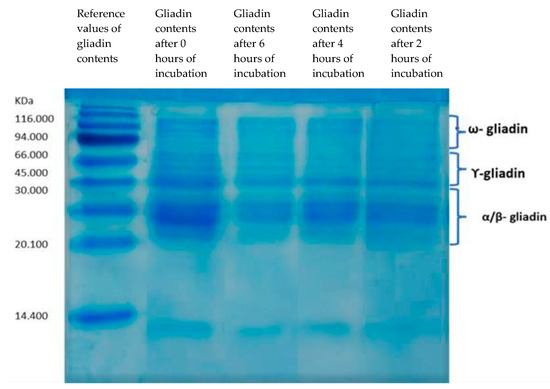 Gliadin degradation after 0, 2, 4, and 6 h of incubation with a mix of B. longum, L. acidophilous, and L. plantarum was assessed by sodium dodecyl-sulfate polyacrylamide gel electrophoresis (SDS-PAGE). A mini SDS-PAGE (Bio-Rad Laboratories GmbH, Munich, Germany) was used, separation was performed using the classical Laemmli method [51], and the bands were stained with Coomassie Blue.