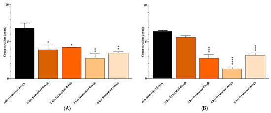 According to the SDS-PAGE profiles of the gliadin polypeptides, a 6 h fermentation of dough with a mix of B. longum, L. acidophilous, and L. plantarum showed the highest gliadin hydrolysis capacity (Figure 1).