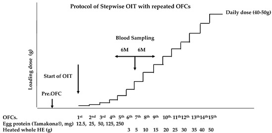 - Sudo, K.; Taniuchi, S.; Takahashi, M.; Soejima, K.; Hatano, Y.; Nakano, K.; Shimo, T.; Koshino, H.; Kaneko, K. Home-based oral immunotherapy (OIT) with an intermittent loading protocol in children unlikely to outgrow egg allergy. Allergy Asthma Clin. Immunol. 2014, 10, 11. [Google Scholar] [CrossRef]