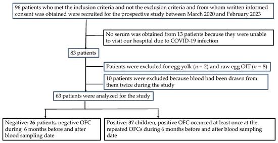The patient selection process is shown in Figure 2. A total of 96 patients met the inclusion criteria before the application of the exclusion criteria. Between March 2020 and February 2023, the parents of each patient provided a signed informed consent for SS-OIT with an HE allergy. Furthermore, 33 patients were excluded [no serum was obtained for analysis (n = 13), receiving treatment for OIT for egg yolk (n = 2) and raw egg (n = 8), and received blood sampling twice during the study (n = 10)]. Thus, the study population included 63 patients [46 (73%) males; median age at testing, 10 years, range 8.7–11.2 years].