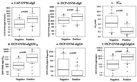 The six serum IgE-related parameters are as follows: CAP-OVM-sIgE (UA/mL), DCP-OVM-sIgE (BUe/mL), binding avidity of OVM-sIgE (1/IC50) (nM), DCP-OVM-sIgG4 (BUg4/mL), the product of DCP-OVM-sIgE multiplied by binding avidity of DCP-sIgE (DCP-OVM-sIgE/IC50), and the product of DCP-sIgE divided by DCP-sIgG4 (DCP-OVM-sIgE/sIgG4) were all significantly higher in the positive group than in the negative group (Table 3 and Figure 3, by Mann–Whitney U test). Among the parameters tested, DCP-sIgE/IC50 and DCP-sIgE/sIgG4 demonstrated good accuracy (AUC ≥ 0.81) with sensitivity of ≥70% and specificity ≥78%, although DCP-OVM-sIgE and CAP-OVM-sIgE by themselves showed good accuracy (AUC 0.7–0.8) for predicting positive OFC during SS-OIT (Figure 4). Receiver operating characteristic (ROC) analysis demonstrated a larger area under curve (AUC) for DCP-OVM-sIgE/IC50 compared with DCP-OVM-sIgE alone (p = 0.03) and also DCP-sIgG4 (p = 0.04). There was no significant difference in the level of AUC among the other parameters (Figure 4). We also determined the adjusted odds ratios of these six parameters by multiple logistic analysis using two factors (age and loading dose of HE) as covariates (Table 4). The highest adjusted odds ratios were observed for DCP-OVM-sIgE/IC50 and DCP-sIgE/sIgG4 (15.6 and 8.6, respectively). Considered together, the two parameters of DCP-OVM-sIgE/IC50 and DCP-sIgE/sIgG4 seem to accurately predict positive OFC during OIT.