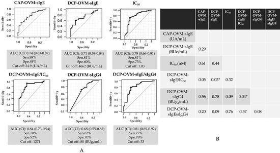 ROC curve analysis for the prediction of HE allergy at repeated OFCs during SS-OIT. (A) Results using six parameters: CAP-OVM-sIgE (UA/mL), DCP-OVM-sIgE (BUe/mL), OVM-sIgE (IC50) (nM), the product of DCP-OVM-sIgE multiplied by avidity of DCP-sIgE (DCP-OVM-sIgE/IC50), DCP-OVM-sIgG4 (BUg4/mL), the product of DCP-sIgE divided by DCP-sIgG4 (DCP-OVM-sIgE/sIgG4) in discriminating positive from negative groups at repeated OFCs during OIT. (B) Comparison of AUCs for p value. * p < 0.05. Sen: sensitivity, Spe: specificity.