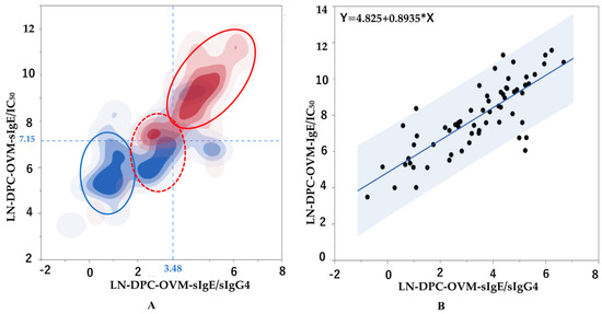 Correlations between two immunological parameters indicative of the patient’s allergic status during SS-OIT in children with HE allergy. (A) Heat map analysis of two parameters (abscissa: ln DCP-OVM-sIgE/IgG4, ordinate: ln DCP-OVM-sIgE/IC50). Horizontal blue dotted line: cut-off level of 3.48 of ln DCP-OVM-sIgE/IgG4. Vertical blue dotted line: cut-off level of 7.15 of ln DCP-OVM-sIgE/IC50. Red circle line: positive group at OFC, blue circle line: negative group at OFC, red dotted circle line: positive and negative groups mixed at OFC. (B) Two-dimensional graph including measurements of both ln DCP-OVM-sIgE/IC50 (abscissa) and ln DCP-OVM-sIgE/sIgG4 (ordinate) showing that the condition of each patient was located on a regression line, along with the 95% confidence interval (gray; R = 0.802, 95% CI: 0.691–0.876, p < 0.001 by Pearson’s correlation test).