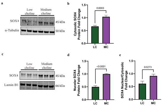 SOX4 protein levels are reduced in both cytoplasm and nucleus in vitro under low-choline conditions. Cortical NPCs were cultured in either LC (5 μM) or MC (70 μM) for 48 h. (a) Representative Western blot of cytosolic SOX4 protein expression in LC and MC conditions. (b) Quantification of SOX4 cytosolic protein levels shows a reduction in SOX4 in NPCs under low-choline conditions compared to MC (cells derived from n = 5–6 dams per condition, 1–4 pups per dam) (p = 0.0003). (c) Representative Western blot of nuclear SOX4 protein expression in LC and MC conditions. (d) SOX4 protein quantification shows a reduction in SOX4 in the nucleus of NPCs under LC conditions compared to MC, suggesting a reduction in SOX4 DNA binding capacity (cells derived from n = 5–6 dams per condition, 1–4 pups per dam) (p < 0.0001). (e) SOX4 nuclear cytosolic ratio is overall reduced under LC conditions (cells derived from n = 5–6 dams per condition, 1–4 pups per dam) (p = 0.0273). Data are mean ± SEM. All data were tested for normality by Brown–Forsythe test and analyzed by an unpaired t-test. LC = low choline, MC = medium choline.