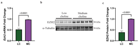 SOX4 is a transcriptional factor that regulates genes involved in the cell cycle and cell migration. The promoter analysis of the SOX4 transcriptional network has been established in different cell types, including cancer and neural crest cells [46,47]. One of these target genes is enhancer of zeste homolog 2 (Ezh2). EZH2 is a major regulatory transcription factor that modulates NPC and IPC differentiation [27,28,48]. Together, SOX4 and EZH2 act as a molecular switch that facilitates the transition of NPCs and IPCs from progenitor cells to differentiated neurons [25,28,29]. To identify if the reduction in SOX4 we had found in NPCs treated with LC (5 µM) influenced this molecular switch, we sought to assess expression levels of EZH2. We first evaluated by qPCR the mRNA levels of Ezh2 and found a 50% reduction in LC compared to MC (Figure 3a). Then, we performed a Western blot to assess protein levels of EZH2, and we observed a reduction of ~65% of EZH2 protein in NPCs exposed to LC (Figure 3b,c). The reduction in both SOX4 and EZH2 in NPCs, under LC conditions, suggested changes to the NPC cell fate. The reduction in this SOX4/EZH2 switch in NPCs potentially helps to explain, in part, earlier observations made by our lab showing that pups from dams fed an LC diet have a reduced number of late born neurons in the cortex of their brain, yet, also have an increased number of early born neurons at embryonic day 17.5 (E17.5), resulting in aberrant cortical layering [14].