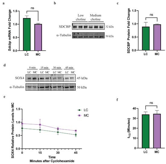Sdcbp mRNA and protein are unchanged in NPCs in vitro. Cortical NPCs were cultured in either LC (5 μM) or MC (70 μM) for 48 h. For half-life and protein degradation rate assays, cortical NPCs were cultured in either LC (5 μM) or MC (70 μM) for 24 h and subsequently treated with cycloheximide. (a) mRNA levels of Sdcbp are unchanged under low-choline conditions (cells derived from n = 6 dams per condition, 1–4 pups per dam) (ns = not significant). (b) Protein levels of SDCBP, determined by Western blot, between LC and MC. (c) SDCBP protein quantification is also unchanged, suggesting SOX4 does not have increased degradation rates due to a reduction in its binding partner SDCBP (ns = not significant). (d) Degradation rate of SOX4 protein is unchanged between under low-choline conditions (cells derived from n = 3–4 dams per condition, 1–4 pups per dam). (e,f) Half-life of SOX4 degradation is unchanged under low-choline conditions, indicating SOX4 is not undergoing degradation more rapidly than medium choline; (cells derived from n = 3–4 dams per condition, 1–4 pups per dam) (ns = not significant). All data were tested for normality by Brown–Forsythe test and analyzed by analyzed by Mann–Whitney test (a,c) or unpaired t-test (e,f). LC = low choline, MC = medium choline.