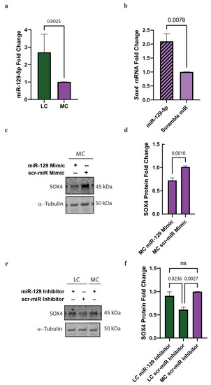 Alternatively, we hypothesized that the proteasomal degradation rate was increased and, therefore, responsible for the reduction in SOX4 in NPCs with an LC status. To test this hypothesis, we treated NPCs with cycloheximide, a ribosomal inhibitor that blocks the translation of mRNA to protein, to determine the subsequent rate of SOX4 degradation over time. We found that SOX4 rapidly degraded and is not apparent after 45 min, matching previous findings [50]. Moreover, we found no differences in the rate of degradation between LC and MC status (Figure 4d,e). The half-life for SOX4 was also found not to be statistically significant between LC and MC status (Figure 4f). Since there was no change to the SDCBP protein nor translation rate of SOX4, we concluded that the degradation rate of SOX4 did not play a role in the reduction of its protein levels. Taken together, these data demonstrate that a reduction in SOX4 protein in NPCs is not mediated by proteasomal degradation. These findings then led us to further investigate the potential role of miR-129-5p in the reduction in SOX4 protein.