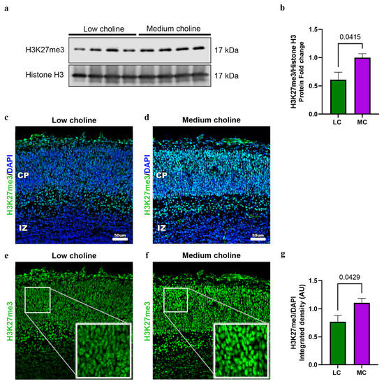 Low choline availability reduces global H3K27me in fetal brains. Dams were placed on either an LC or MC diet from E11.5 to E17.5. (a) Cerebral cortex of E17.5 embryos were dissociated to extract total histones. Cell lysates were analyzed by Western blot with antibodies to H3K27me3 and Total Histone 3 (H3). We observed a reduction in the protein levels of H3K27me3 in LC brains. (b) Quantifications of protein levels are normalized to H3 and presented as fold change. (n = 4 dams; 1 pup per dam) (p = 0.0415). (c) Representative immunostaining from an E17.5 cerebral cortex exposed to low choline or (d) medium choline. Low-choline brains exhibit reduced levels of H3K27me3 when compared to medium choline. (e) H3K27me3 staining in the CP in low-choline brains (f) H3K27me3 staining in the CP in medium choline brains. Cerebral cortex exposed to LC availability have lower H3K27me3 expression compared to MC. (g) Quantification of H3K27me protein levels was performed in LC and MC by detection of integrated density from immunofluorescence, levels were normalized with DAPI. (n = 4–5 dams per condition, 1 pup per dam) (p = 0.0429). Data are mean ± SEM. All data were tested for normality by Brown–Forsythe test and statistical analysis was performed using an unpaired t-test.