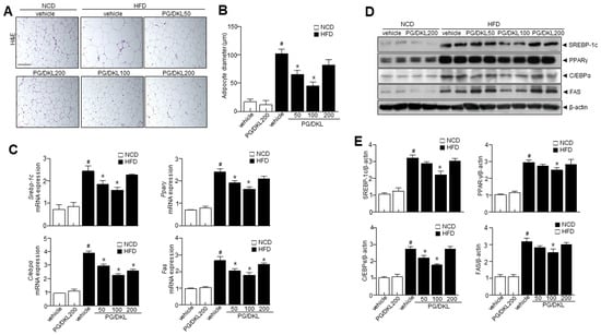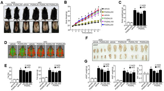 Six-week-old male C57BL/6J mice were purchased from Orient Science Co. Seongnam, Republic of Korea. All the mice were housed at a designated animal laboratory. The environmental temperature was set at 22 ± 2 °C, and a 12 h L/D cycle was maintained. The mice were acclimated for a week on a regular chow diet. After a week of acclimatization, the animals were assigned to one of six groups that were weight matched. Each group consisted of 8 animals. Group 1, the normal diet (NCD) group, mice were fed a standard chow diet containing 11.5% fat, 20.8% protein, and 67.7% carbohydrates. Group 2, NCD mice supplemented with PG/DKL 200 mg/kg. Group 3, HFD group, mice fed with an HFD containing 60% fat, 20% protein, and 20% carbohydrates (Rodent Diet D12492, Research Diets, New Brunswick, NJ, USA). Group 4, HFD mice supplemented with PG/DKL 50 mg/kg. Group 5, HFD mice supplemented with PG/DKL 100 mg/kg. Group 6, HFD mice supplemented with PG/DKL 200 mg/kg. Mice were fed with NCD or HFD with vehicle or 50, 100, 200 mg/kg PG/DKL once daily for 9 weeks by oral gavage, and the body weight of the experimental animals was measured once a week for 9 weeks. Food intake was measured daily by cage and divided by the number of mice within the cage. At the end, all mice were euthanized following an intraperitoneal injection of 100 mg/kg ketamine (#VINB-KET0-7021, Henry Schein Animal Health, Dublin, OH, USA) with 10 mg/kg xylazine hydrochloride supplement (#X1251-1G, Sigma-Aldrich, St. Louis, MO, USA). Specifically, collected whole blood was stored at 2 °C for 30 min and then centrifuged to collect serum. All other samples were stored at −80 °C. Housing and handling of animals were done as suggested in the Jeonbuk National University Hospital animal care and used committee guidelines. The approval number assigned to this study is JBUH-IACUC-2021-4-1.