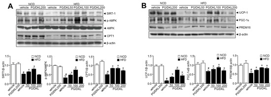 Synergistic effects of Panax ginseng (PG) and Diospyros kaki leaf (DKL) promote thermogenic program in adipose tissue. Mice were fed with NCD or HFD with vehicle or 50, 100, 200 mg/kg PG/DKL once daily for nine weeks by oral gavage. (A) Immunoblotting using antibodies against SIRT1, p-AMPK, AMPK, CPT1, and β-actin in eWAT and respective quantitative analysis. (B) Immunoblotting using antibodies against UCP-1, PGC-1α, PRDM16, and β-actin in the eWAT and respective quantitative analysis. Data are presented as mean ± SEM (n = 8, # p < 0.05 vs. NCD + vehicle, * p < 0.05 vs. HFD + vehicle). Epididymal white adipose tissue; eWAT.