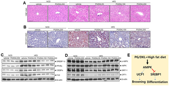 eWAT expansion is known to cause ectopic fat accumulation in the liver. Thus, morphological investigations were done to assess the impact of PG/DKL on liver tissue. Histopathological analysis of the liver tissues indicated that PG/DKL supplementation substantially reduced the size and number of lipid droplets in liver tissues of HFD-induced obese mice (Figure 7A,B). Moreover, SREBP-1, C/EBPα, PPARγ, and FAS protein expressions were significantly higher in HFD mice than in the NCD group. However, supplementation with PG/DKL decreased the expression of these proteins that regulate fatty acid biosynthesis (Figure 7C). Additionally, p-AMPK and SIRT1 expressions were reduced in the HFD mice compared to in the NCD mice. However, PG/DKL reversed the effect by increasing expressions of p-AMPK and SIRT1 (Figure 7D), suggesting enhanced lipolysis, fatty acid oxidation, and mitochondrial biogenesis. In this study, there was no difference in hepatic lipogenesis parameters, including SREBP-1c, PPARγ, C/EBPα, and FAS and metabolic reprogramming genes, including p-AMPK, SIRT1 and CPT1 at the highest dose, 200 mg/kg of PG/DKL-administered NCD feeding mice compared with NCD-control mice (Figure 7).