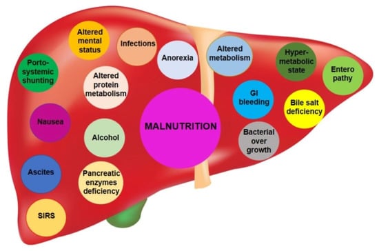 In 2016, the Global Leadership Initiative on Malnutrition (GLIM) stated that a combination of phenotypical and etiological criteria are required to diagnose malnutrition, including reduced nutrient intake in the presence of acute or chronic inflammatory diseases, weight loss, or reduction in muscle mass [15]. The important role of malnutrition and sarcopenia in cirrhosis is due to the high prevalence and development of complications (hepatic encephalopathy, infections, and ascites); moreover, they affect overall clinical outcomes, including pre-and post-transplant survival and quality of life [16,17].