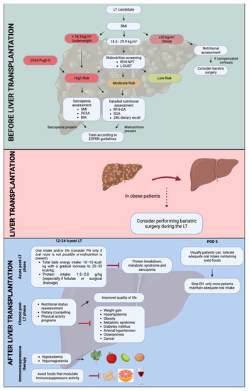 Based on these previous considerations, malnutrition, sarcopenia, and obesity should not only be investigated and assessed in patients with liver cirrhosis but also specifically managed in those awaiting LT.