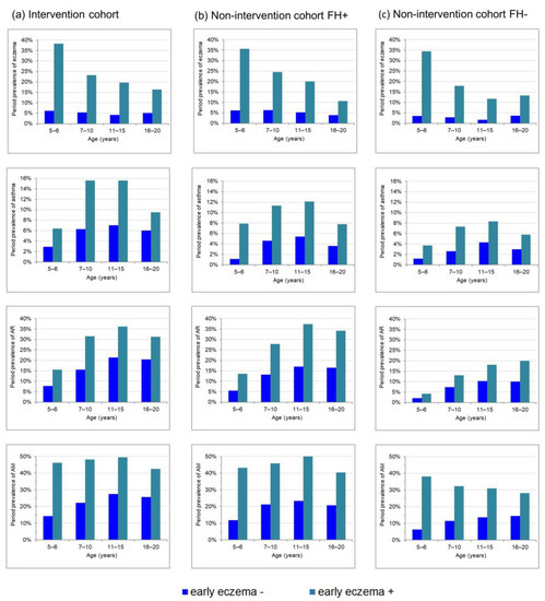 The primary outcomes of the present analyses are period prevalence of eczema, asthma, and allergic rhinitis/hay fever as well as the cumulative incidence of these up to 20 years of age. Any “yes” response to physician’s diagnosis in the period and/or treatment in the last 12 months was used to determine period prevalence. Any positive reply during the lifetime of the child was used to determine cumulative incidence. Early eczema was defined considering physician’s diagnosis of eczema in the 1st, 2nd, and 3rd year of life as answered by the parents in the respective questionnaires.