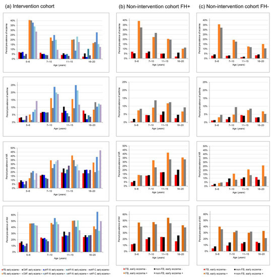Prevalence of allergic diseases from childhood to young adulthood by eczema during the first three years and feeding groups (a) in the intervention-cohort stratified for the full breastfeeding group (FB) and for the four groups supplemented only with their randomized formula, (b) in the non-intervention-cohort with family risk (FH+) and (c) without risk (FH−) both cohorts stratified by full breastfeeding.