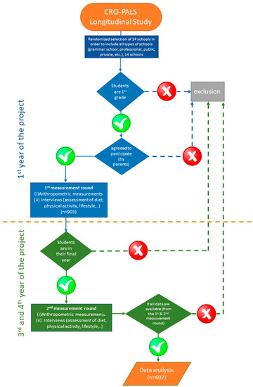 To assess the adolescents diet quality, data for the intake of fruits and vegetables, fast food, and sweetened drinks (carbonated and non-carbonated) were used. The total fruit intake of the respondents included fresh, cooked or canned fruit, dried fruit, nuts, and fruit juices, while the total vegetable intake included all types of vegetables (except potatoes) in fresh, cooked, or canned form. Complex dishes such as stews or smoothies were not included in the total, unless the ingredients were listed individually with quantities (in grams). The chosen definition is based on a Prynne et al. [22] study. Fruit and vegetable intake was shown in two ways: (1) g/day following the recommendations of the World Health Organization (WHO) and (2) relative to energy intake (g/1000 kcal). The total intake of fast food included various types of pizzas, sandwiches, hamburgers, salty pies, and other bakery products. In the total amount, we included dishes prepared in fast food restaurants, but also prepared at home. The exception were dishes made from whole meal bread without additional sauces such as mayonnaise or ketchup. Sweetened drinks were divided into two categories—carbonated and non-carbonated. Carbonated sweetened beverages included non-diet carbonated beverages that also contained sugar, while non-carbonated sweetened beverages included industrial fruit juices, excluding hot drinks and milk. Definitions for choosing fast food and sweetened beverages were based on previous study by Lioret et al. [23]. The intake of fast food and sweetened beverages were shown relative to energy intake (g/1000 kcal). The implementation of data collection is shown in the flow diagram that follows in Figure 1.