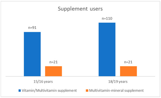 In the Supplemental Materials (Tables S1–S9), we additionally presented detailed results regarding comparisons between dietary supplement users and non-users according to gender and age (Tables S1 and S2). The tables also show statistically significant differences between dietary supplement users and non-users of the same gender and age. Statistically significant differences between girls who were users and who were not users of dietary supplements were visible for vitamins: thiamine (p = 0.02), riboflavin (p = 0.01), niacin (p = 0.02), pantothenic acid (p < 0.001), and folate (p = 0.03) at the age of 15/16 years; there were also differences for riboflavin (p = 0.04), pantothenic acid (p < 0.001), vitamin B6 (p = 0.005), vitamin E (p < 0.001), and folate (p = 0.01) at the age of 18/19 years. In boys, statistically significant differences were found between users and non-users of dietary supplements for the intake of thiamine (p < 0.001), riboflavin (p < 0.001), pantothenic acid (p < 0.001), vitamin B6 (p < 0.001), vitamin E (p < 0.001), folate (p < 0.001), and vitamin B12 (p = 0.02) at the age of 15/16 years; there were differences for thiamine (p = 0.01), riboflavin (p < 0.001), pantothenic acid (p = 0.004), vitamin C (p = 0.01), vitamin E (p < 0.001), and folate (p = 0.005) at the age of 18/19 years. The Supplementary Materials (Table S3) provide a detailed explanation of the vitamin intake of dietary supplement users and non-users following EFSA’s recommendations. The results follow the results of the USDA recommendations. Exceptions were found at the age of 15/16 in girls, dietary supplement non-users, for niacin intake, where non-users had a higher average achieved intake. For niacin, the share of respondents who consumed less than the recommended intake was higher in girls, for dietary supplement users. Additionally, exceptions were found in boys, dietary supplement non-users, for vitamin K intake, where non-users had a higher average achieved intake, and the users had a higher proportion of respondents who ingested less than the recommended intake. At the age of 18/19, for niacin intake, boys and girls, dietary supplement non-users, had a higher average intake.