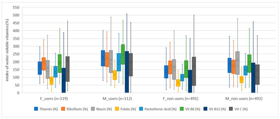 Percentage of water-soluble vitamin intake of dietary supplement users and non-users by gender, expressed as a percentage of the reference values of USDA recommendations. The number of girls and boys, dietary supplement users and non-users, is shown in brackets. Box plots are percentiles (Q1—lower quartile, Q3—upper quartile), median values, and mean values.