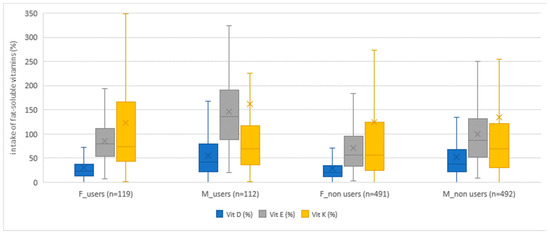 Percentage of fat-soluble vitamin intake of dietary supplement users and non-users by gender, expressed as a percentage of the reference values of USDA recommendations. The number of girls and boys, dietary supplement users and non-users, is shown in brackets. Box plots are percentiles (Q1—lower quartile, Q3—upper quartile), median values, and mean values.