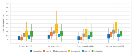 Percentage of mineral intake of dietary supplement users and non-users by gender, expressed as a percentage of the reference values of USDA recommendations. The number of girls and boys, dietary supplement users and non-users, is shown in brackets. Box plots are percentiles (Q1—lower quartile, Q3—upper quartile), median values, and mean values.