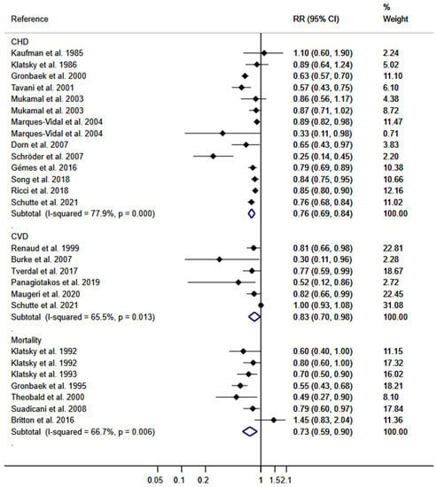 | Klatsky et al. 1990 [37] | EE.UU. | Cohort | 28,488 | 40.5 | General population | 8 | CHD CVD |
