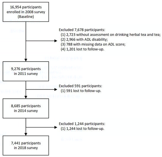Since the survey on drinking herbal tea began in 2008, this study included and analyzed the data from 2008 to 2018 of the CLHLS. For the 2008 survey, 16,954 respondents participated and were interviewed. Participants aged above 65 years old who did the survey of drinking herbal tea and drinking tea at baseline and were followed up at least one wave later were eligible to include in this study. We excluded 2723 participants without an assessment on drinking herbal tea and tea at baseline, 2966 participants with ADL disability at baseline, 788 missing data on ADL score, and 3036 participants lost to follow-up, leaving a final sample of 7441 participants (Figure 1).