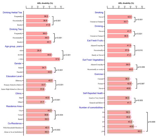 The incidence of ADL disability was 40% (2974/7441) in all participants. The individuals in the group who rarely drank herbal tea or tea had a higher prevalence of ADL disability than other groups (p < 0.05). The incidence of ADL disabilities increases with advancing age. Females had a higher incidence of ADL disabilities compared to males. Urban residents had a higher incidence of ADL disabilities compared to rural residents. Additionally, individuals who frequently eat fresh fruits or vegetables had a lower incidence of ADL disabilities. Surprisingly, current or former smokers and drinkers had a lower incidence of ADL disability, which might be due to survivor bias or immortality bias. Among participants with different comorbidities, the higher the number of comorbidities, the higher the incidence of ADL disability (Figure 2).