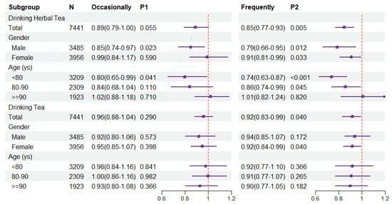 Based on model 4, subgroup analysis showed that occasionally drinking and frequently drinking herbal tea had protective effects on ADL disability in males (HR = 0.85 and 0.79, respectively). In contrast, the protective effect was smaller in females (HR = 0.91). Meanwhile, the protective effect was greatest in those <80 years old (HR = 0.74, 95% CI = 0.63–0.87), while it gradually weakened in older age groups. Unlike drinking herbal tea, the protective effect of frequently drinking tea was stronger in women (HR = 0.92, 95% CI = 0.84–0.99) (Figure 3).